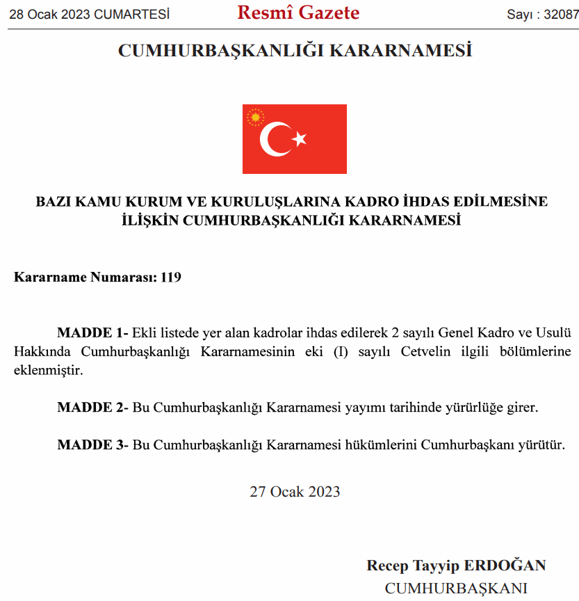 28 Ocak 2023 tarihli Resmi Gazete'de yayınlanan son dakika açıklamasında Emniyet Genel Müdürlüğü bünyesine kadro ihdası yapıldı. Yapılan kadro ihdası ile birlikte EGM büneysine 10 bin polis alımı yapılacağı görüldü. Cumhurbaşkanı Recep Tayyip Erdoğan'ın imzası ile yayınlanan son dakika açıklamasında şu ifadelere yer verildi: