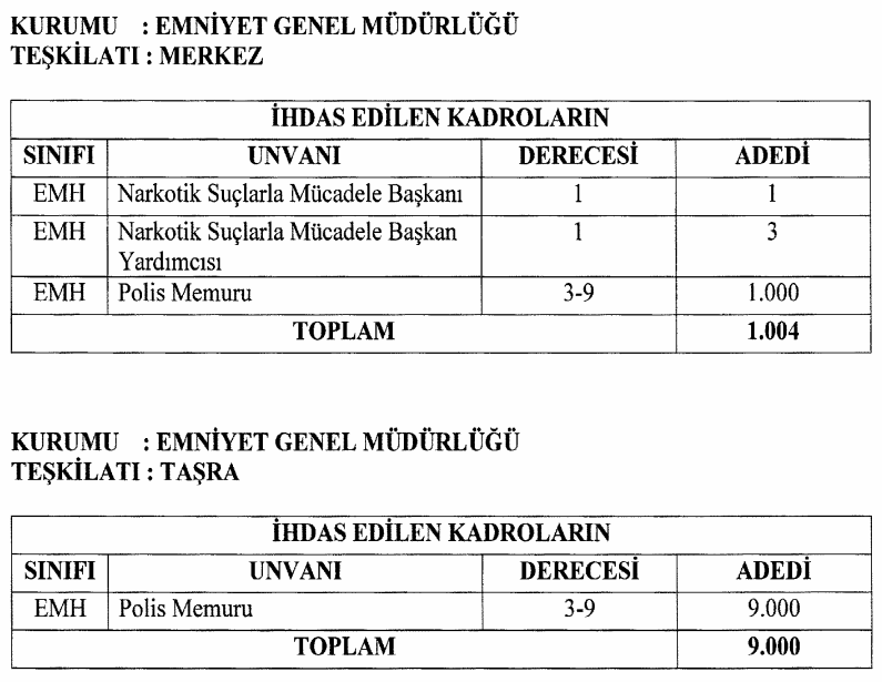 Söz konusu karara baktığımızda EGM bünyesine merkez teşkilatında istihdam etmek üzere 1004 polis memuru alımı yapılacağını söylendi.