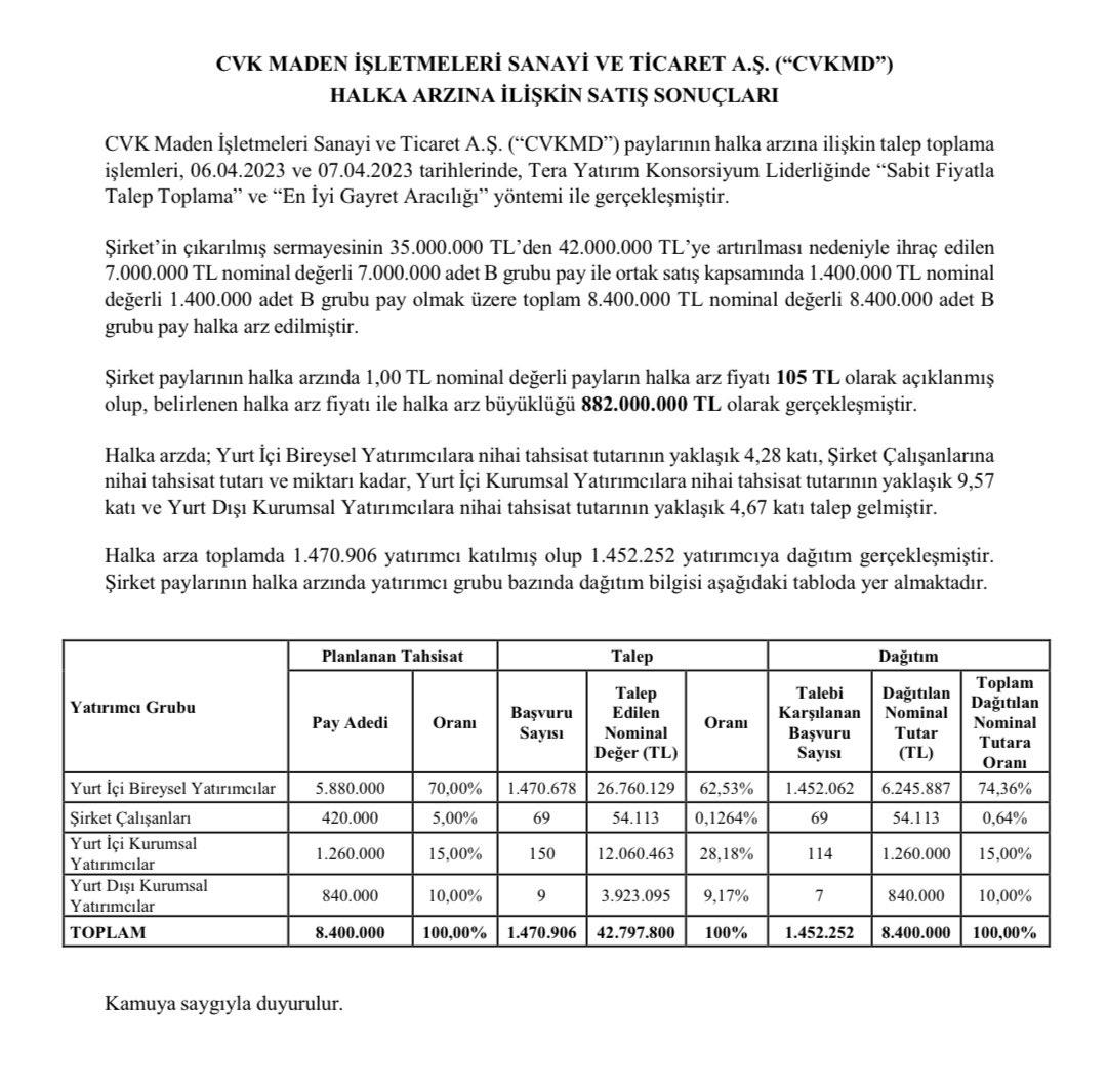 #cvkmd hisse halka arz sonuçları açıklandı. Arza 1.470.906 yatırımcı katılmış 1.452.252 yatırımcıya pay dağıtılmıştır.