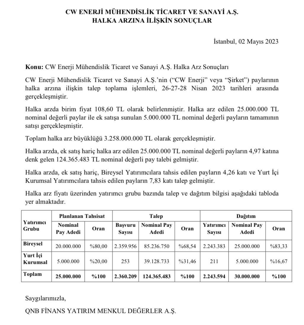 SPK tarafından onayı geçen ay gelen CW Enerji Mühendislik Ticaret ve Sanayi AŞ'nin geçen hafta talep toplaması yapıldı. Talep toplamadan sonra bugün beklenen açıklama geldi ve CW Enerji halka arz sonuçlarının açıklandığına yer verildi.