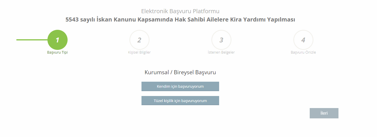 "Elektronik Başvuru Platformu" üzerinden yapılan "5543 sayılı İskan Kanunu Kapsamında Hak Sahibi Ailelere Kira Yardımı Yapılması" başvurusunun adımları şu şekilde: