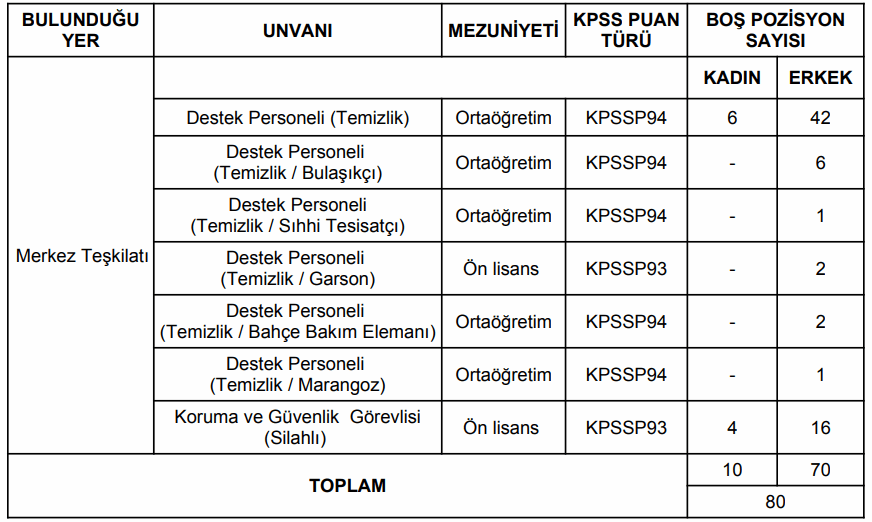 Diyanet İşleri Başkanlığı temizlik personeli, güvenlik görevlisi, bulaşıkçı, sıhhi tesisatçı, garson, bahçe bakım elemanı ve marangoz kadrolarında personel alımı yapılacak.