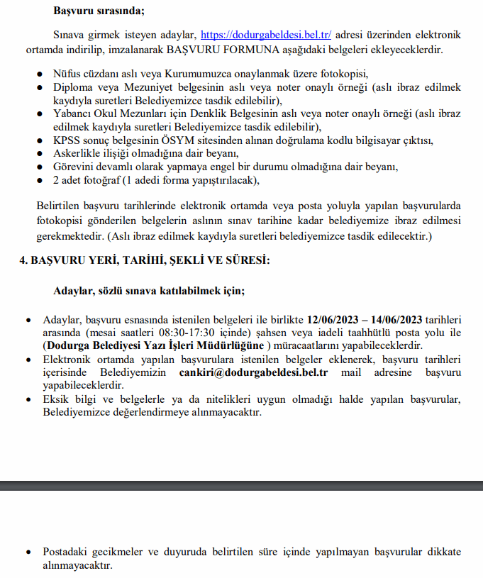 Çankırı ili Orta İlçesi Dodurga Belde Belediye Başkanlığı tarafından yayınlanan son dakika açıklamasında 55 KPSS ile ekonomist alımı yapılacağına yer verildi. Yayınlanan personel alımına baktığımızda başvuruların 12 Haziran 2023 tarihinde başlayacağına yer verildi.