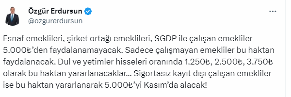 "Esnaf emeklileri, şirket ortağı emeklileri, SGDP ile çalışan emekliler 5.000₺'den faydalanamayacak. Sadece çalışmayan emekliler bu haktan faydalanacak. Dul ve yetimler hisseleri oranında 1.250₺, 2.500₺, 3.750₺ olarak bu haktan yararlanacaklar… Sigortasız kayıt dışı çalışan emekliler ise bu haktan yararlanarak 5.000₺'yi Kasım'da alacak"