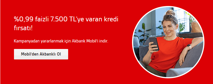 "%0,99 faizli 7.500 TL'ye varan kredi fırsatı! Kampanyadan yararlanmak için Akbank Mobil'i indir." başlığı ile yayımlanan kredi kampanyasında başvurular 30 Eylül 2022 tarihine kadar alınacak. Söz konusu kredi ile ilgili yapılan açıklamada "Kredi başvurusu Akbanklı Ol sürecinin tamamlanması ardından Akbank Mobil üzerinden gerçekleştirilebilir." denildi.