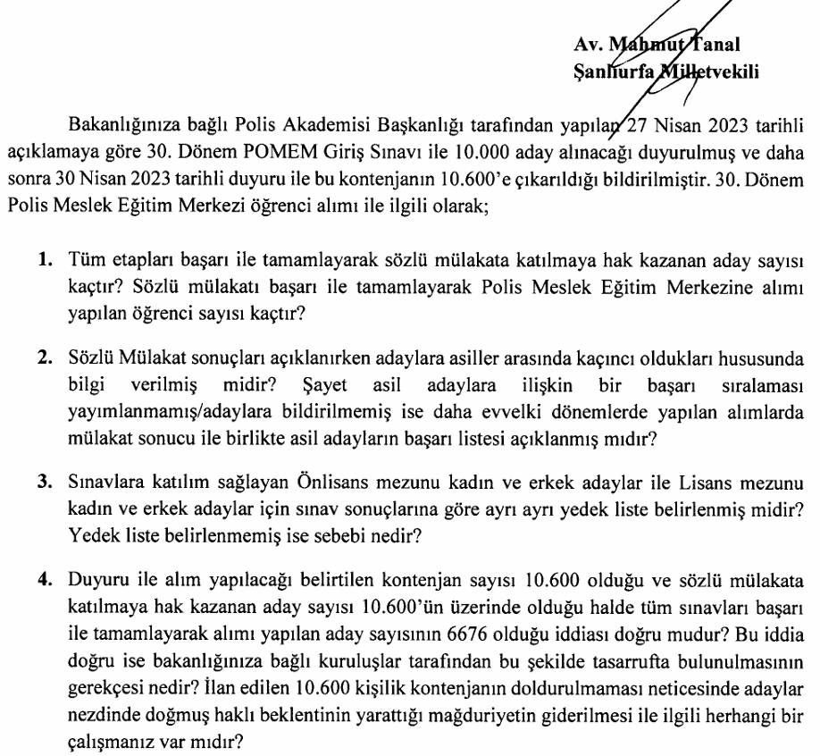 Mahmut Tanal'ın da soru önergesi şu şekilde: