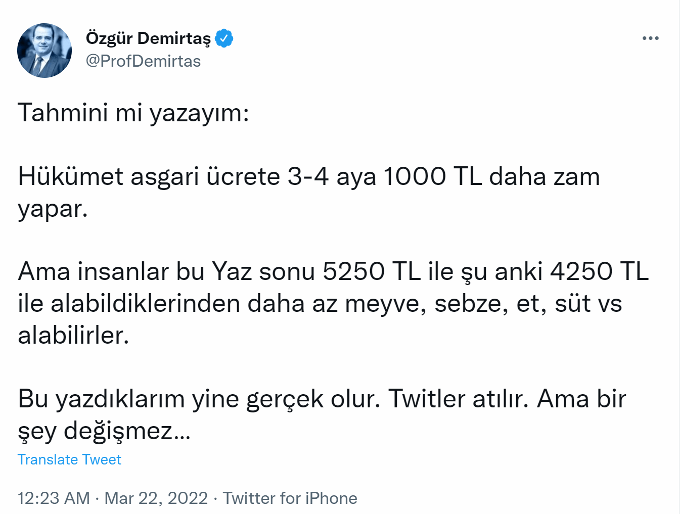 "Tahminimi yazayım: Hükümet asgari ücrete 3-4 aya 1000 TL daha zam yapar. Ama insanlar bu yaz sonu 5250 TL ile şu an 4250 TL ile alabildiklerinden daha az meyve, sebze, et, süt vs alabilirler. Bu yazdıklarım yine gerçek olur. Twitler atılır. Ama bir şey değişmez…"
