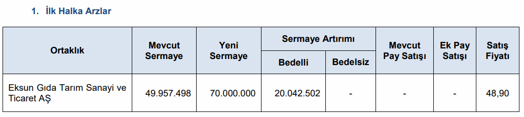 Eksun Gıda'nın halka arzı 48.90 TL seviyesinden olacak. Borsa yatırımcıları, neden bu kadar yüksek fiyattan talep toplama olacağını merak ediyor. Sizce fgiyatı yüksek mi düşük mü? Aşağıdaki yorum kısmından yazın. İşte SPK'dan konu ile ilgili yapılan son dakika açıklaması ve hisse halka arz detayları: