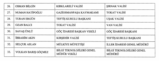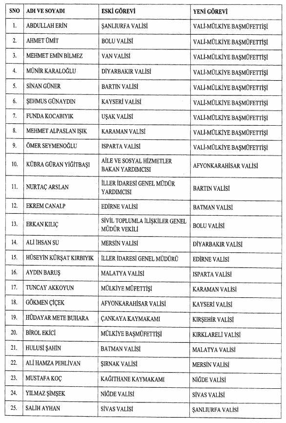Cumhurbaşkan Erdoğan'ın imzası ile Valiler Kararnamesi Resmi Gazete'de yayımlandı. Yayımlanan Valiler Kararnamesinde yeni valiler şu şekilde :