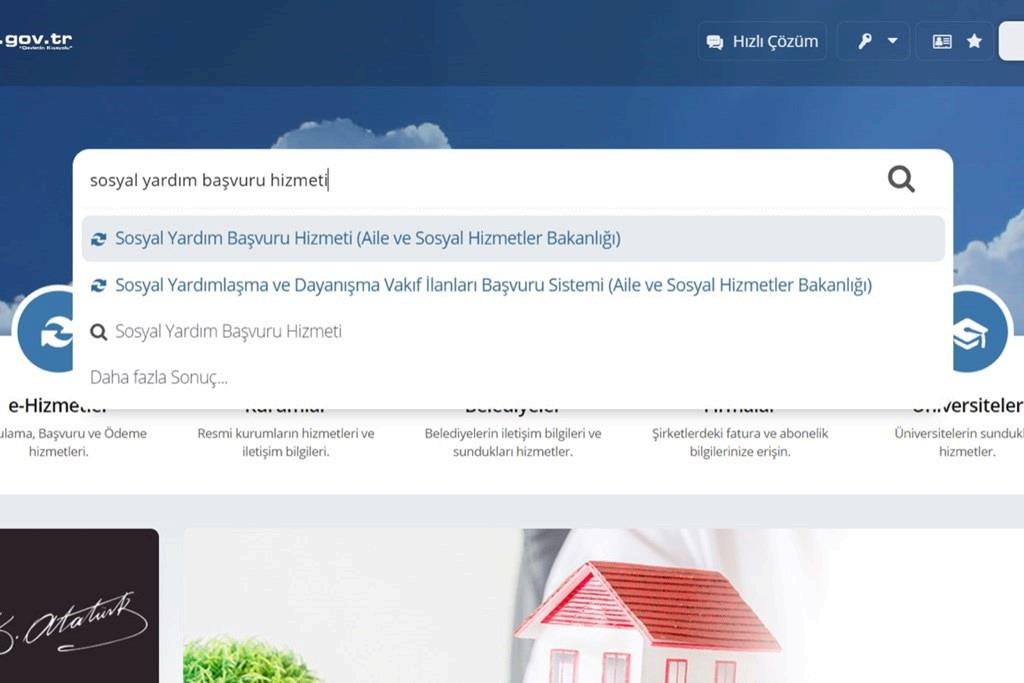 E devlet üzerinden doğalgaz yardımı başvurusu e devlet kapısından yapılıyor. E devlet kapısına (turkiye.gov.tr) adresine gittikten sonra aşağıdaki gibi arama kısmına sosyal yardım başvuru hizmeti yazmanız gerekmektedir.