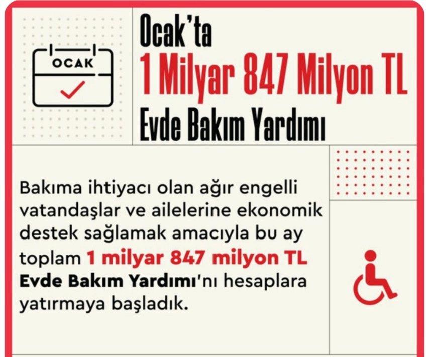 "Bakıma ihtiyacı olan ağır engelli vatandaşlar v eailelerine ekonomik destek sağlamak amacıyla bu ay toplam 1 milyar 847 milyon TL evde bakım yardımını hesaplara yatırmaya başladık" denildi.