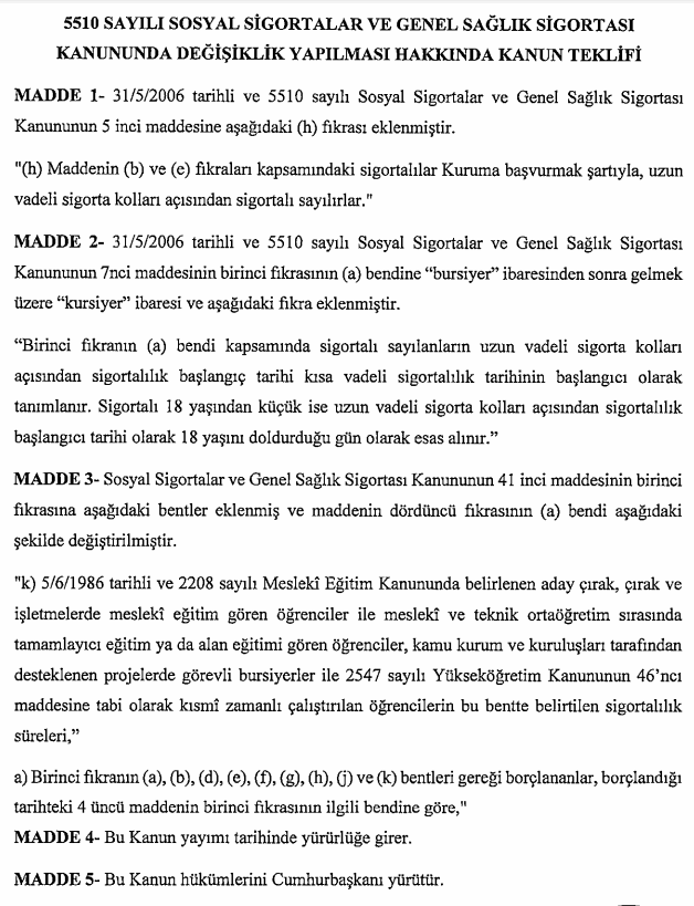 "5510 SAYILI SOSYAL SİGORTALAR VE GENEL SAĞLIK SİGORTASI KANUNUNDA DEĞİŞİKLİK YAPILMASI HAKKINDA KANUN TEKLİFİ