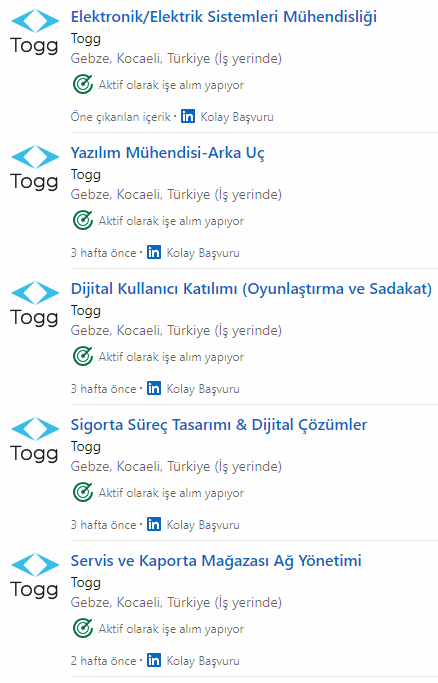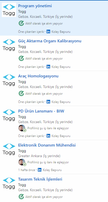 TOGG fabrikasının açılışına kısa süre kala iş ilanlarına hız verildi. TOGG'un iş ilanı başvurularını yayınladığı sayfaya baktığımızda geçen hafta 50 pozisyon için personel alımı yapıldığı görülürken şimdi 58 pozisyona persone lalımı yapıldığı görüldü.