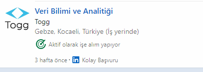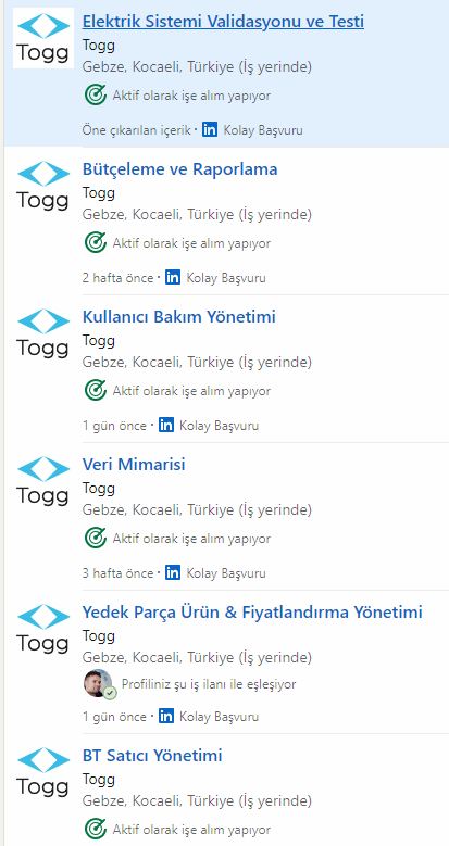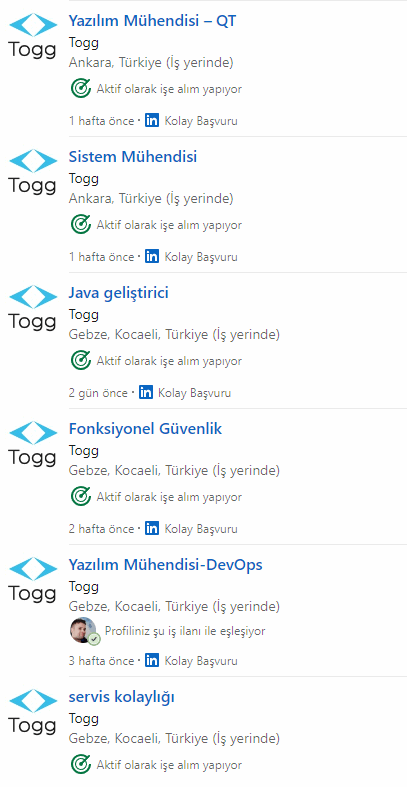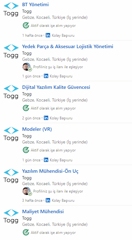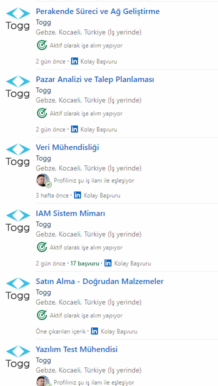 İlanlara başvuru yapmak isteyen adayların TOGG'un Linkedin sayfasına gitmesi gerekmektedir. https://www.linkedin.com/company/togg2022/jobs/?originalSubdomain=tr adlı sayfada kadrolara başvurunuzu yapabilirsiniz.