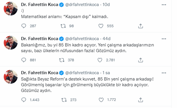 "Sağlıkta Beyaz Reform'a destek kuvvet, 85 Bin yeni çalışma arkadaşı! Görülmemiş başarılar için görülmemiş büyüklükte bir kadro açılıyor. Gözümüz aydın.