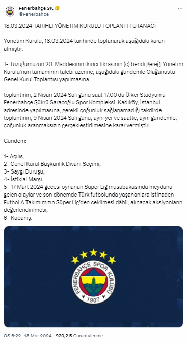 toplantının, 2 Nisan 2024 Salı günü saat 17.00'da Ülker Stadyumu Fenerbahçe Şükrü Saracoğlu Spor Kompleksi, Kadıköy, İstanbul adresinde yapılmasına, gerekli çoğunluk sağlanamadığı takdirde toplantının, 9 Nisan 2024 Salı günü, aynı yer ve saatte, aynı gündemle, çoğunluk aranmaksızın gerçekleştirilmesine karar vermiştir.