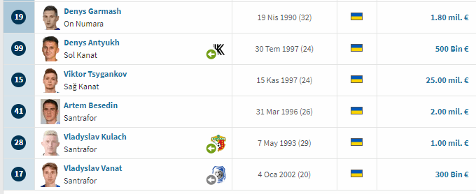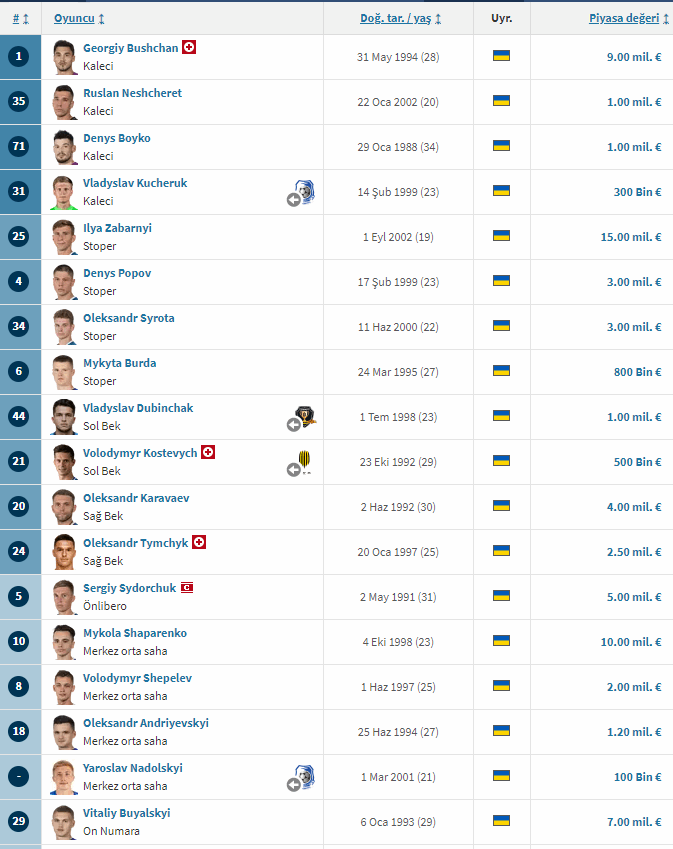 Dinamo Kiev'in kadrosuna baktığımızda en değerli oyuncusunun 25 milyon Euroluk değeri ile Viktor Tsygankov olduğu görülüyor. İkinci sırada ise 15 milyon Euroluk değeri ile İlna Zabarnyi. İşte kadronun tamamı: