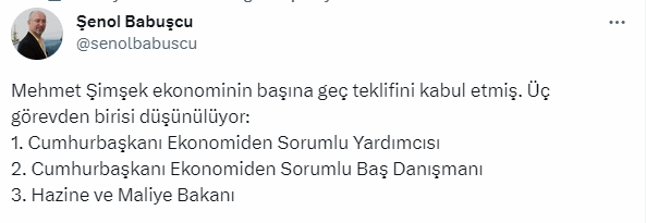 Babuşçu yaptığı açıklamada Mehmet Şimşek'in görevi kabu lettiği ve 3 görev arasından birinde yeni dönemde olacağına yer verildi. "Mehmet Şimşek ekonominin başına geç teklifini kabul etmiş. Üç görevden birisi düşünülüyor" diyerek açıklama yapan Babuşçu, görevleri şu şekilde verdi: