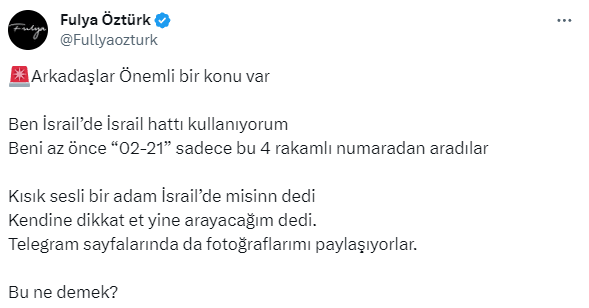 İsrail'de olduğu için İsrail hattı kullandığını söyleyerek sözlerine başlayan Öztürk, birinin kendisini aradığını ve kısık sesle kendine dikkat et yine arayacağım dediğini aktardı.