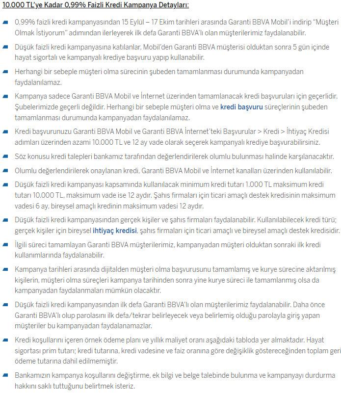 Kredi başvurunuzu Garanti BBVA Mobil ve Garanti BBVA İnternet'teki Başvurular > Kredi > İhtiyaç Kredisi adımları üzerinden azami 10.000 TL ve 12 ay vade olarak seçerek kampanyalı krediye başvurulabileceği belirtilerek kredi talepleri banka tarafından değerlendirilerek olumlu bulunması halinde karşılanacağı aktarıldı.