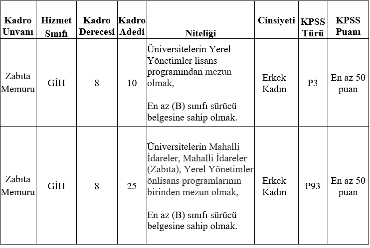 - İlan edilen zabıta memuru kadroları için, mezun olunan okul itibarıyla öğrenim şartını taşımak ve bu öğrenimle ilgili olarak 2022 yılı Kamu Personel Seçme Sınavından (KPSS) alım yapılacak unvanların karşısında belirtilen puan türlerinden, belirtilen asgari KPSS puanını almış olmak,