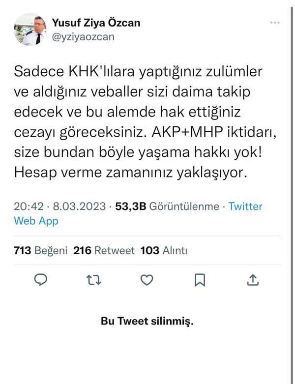 Özcan'ın önce paylaşıp sonra sildiği paylaşımında şu ifadeleri kullandığı görüldü: "Sadece KHK'lılara yaptığınız zulümler ve aldığınız veballer sizi daima takip edecek ve bu alemde hak ettiğiniz cezayı göreceksiniz. AK Parti-MHP iktidarı size bundan böyle yaşama hakkı yok! Hesap verme zamanınız yaklaşıyor"