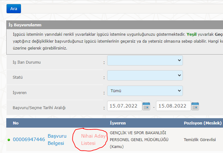 İş başvurularım kısmına tıkladıktan sonra karşınıza aşağıdaki ekran çıkacak. Bu ekranda gösterdiğimiz yerdeki nihai aday listesi kısmına tıklayın.