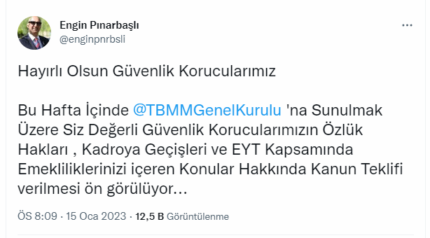 Pınarbaşlı Twitter adresinden konu ile ilgili yaptığı açıklamada, "Hayırlı Olsun Güvenlik Korucularımız. Bu Hafta İçinde @TBMMGenelKurulu 'na Sunulmak Üzere Siz Değerli Güvenlik Korucularımızın Özlük Hakları , Kadroya Geçişleri ve EYT Kapsamında Emekliliklerinizi içeren Konular Hakkında Kanun Teklifi verilmesi ön görülüyor" ifadelerini kullandı.