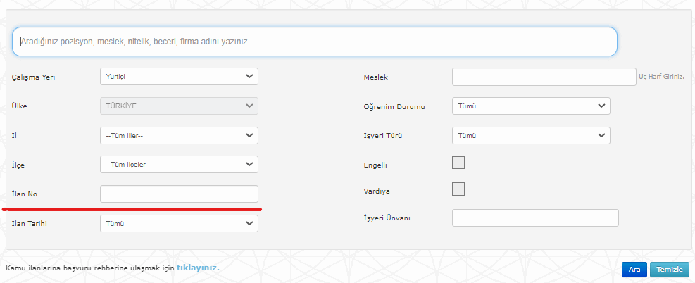 İlan No yazın kısma başvuru yapacağınız kadronun ilanı numarasını yazın ve ara yazan kısma basın ilanlar aşağıda sıralanacaktır.