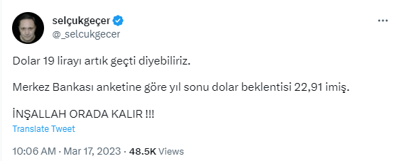 Twitter hesabından paylaşım yapan Selçuk Geçer, 'Dolar 19 lirayı artık geçti diyebiliriz. Merkez Bankası anketine göre yıl sonu dolar beklentisi 22,91 imiş. İnşaallah orada kalır!' dedi.