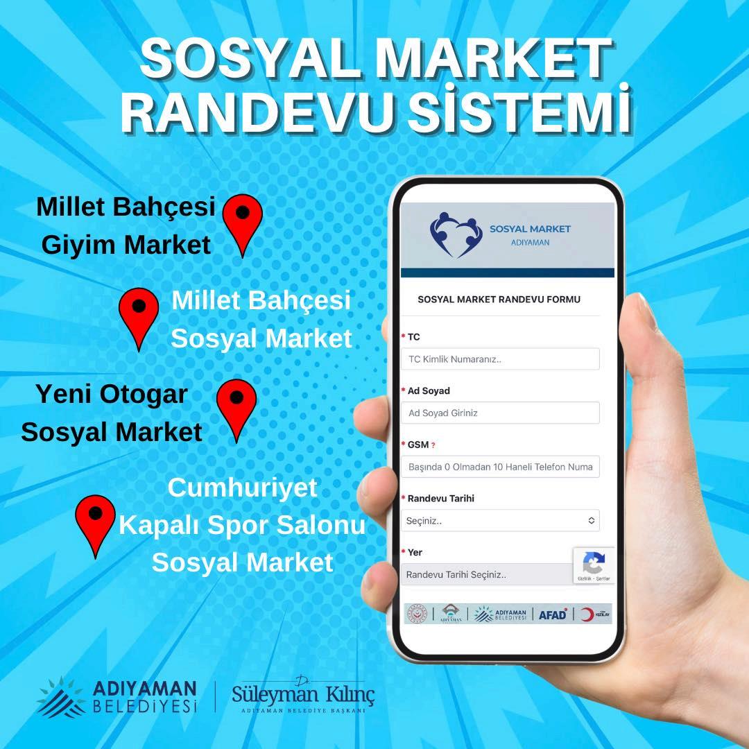 Adıyaman sosyal market başvurusu hakkında açıklama yapan belediye, 'Adıyaman Afet koordinasyon Merkezi ile birlikte faaliyetlerini yürüttüğümüz sosyal marketlerimizde online randevu sistemine geçmiş bulunuyoruz. İhtiyaç duyan vatandaşlarımızın gıda, temizlik, giyim ve bebek ürünleri gibi markette bulunan ürünlerden istediğini alabilmesine imkan sağlayan bu marketlerimizden yararlanmak isteyen vatandaşlarımız artık http://sosyalmarket.adiyaman.bel.tr adresinden randevu oluşturabilirler. Vatandaşlarımızın marketlerimizden sorunsuz faydalanabilmesi için kimlik veya geçici kimlik belgelerini yanlarında bulundurması gerekmektedir' ifadelerini kullandı.