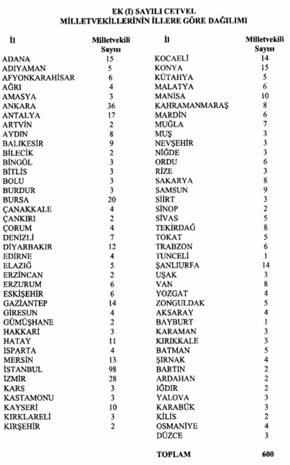 Tabloya baktığımızda deprem bölgesinde herhangi bir değişiklik olmadığı görülüyor. 81 ilde toplamda 600 vekil çıkacak. İşte 81 ilde vekillerin sayı dağılımları: