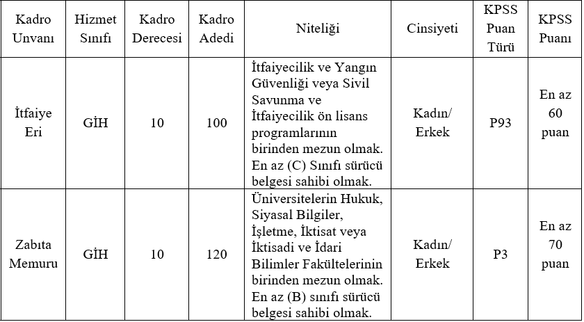 • İlan edilen itfaiye eri ve zabıta memuru kadroları için, mezun olunan okul itibarıyla öğrenim şartını taşımak ve bu öğrenimle ilgili olarak 2022 yılı Kamu Personel Seçme Sınavından (KPSS) alım yapılacak kadroların karşısındaki puan türlerinden, belirtilen asgari KPSS puanını almış olmak,