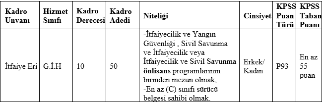 ● İlan edilen itfaiye eri kadroları için, mezun olunan okul itibarıyla öğrenim şartını taşımak ve bu öğrenimle ilgili olarak 2022 yılı Kamu Personel Seçme Sınavından (KPSS) alım yapılacak kadroların karsısındaki puan türünden, belirtilen asgari KPSS puanını almış olmak,