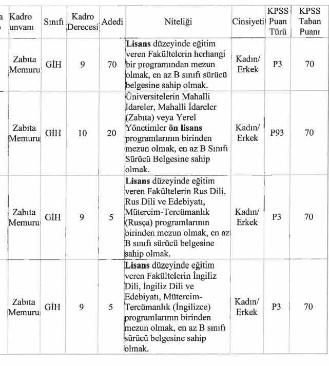 100 zabıta alımına başvuru yapacak adayların aşağıdaki şartları taşıması gerekmektedir: