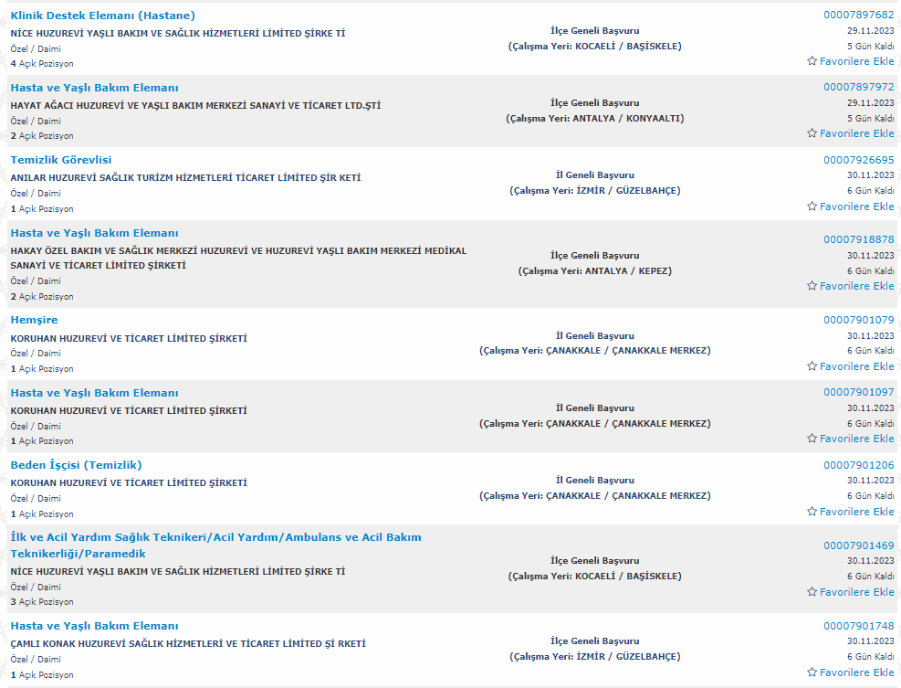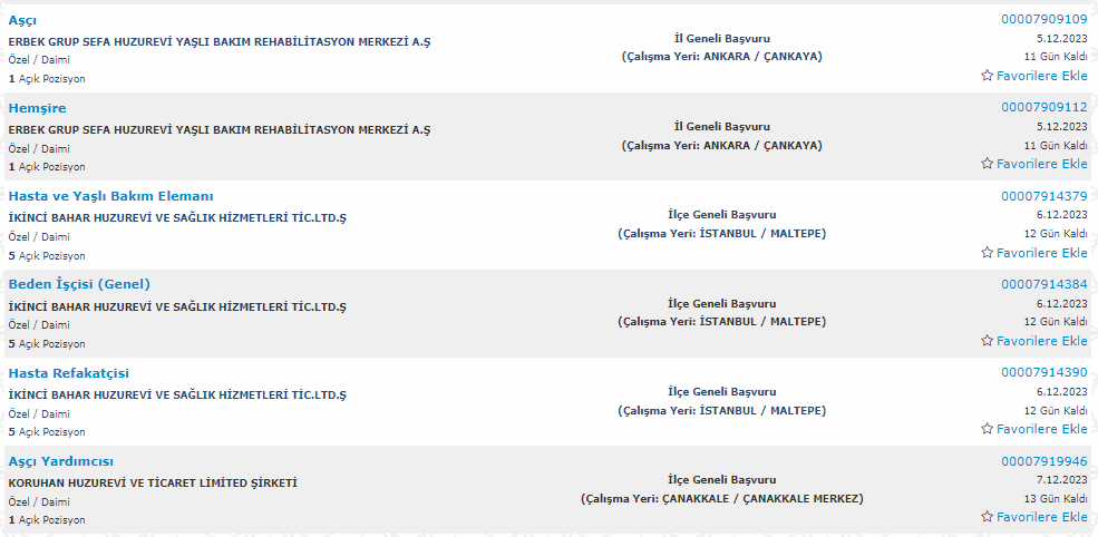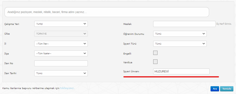 İş arama sayfasında yukarıdaki gibi İŞYERİ UNVANI yazan kısma Huzurevi yazın ve ARA butonuna tıklayın. İl İlçe seçimi yapmanıza gerek yoktur.