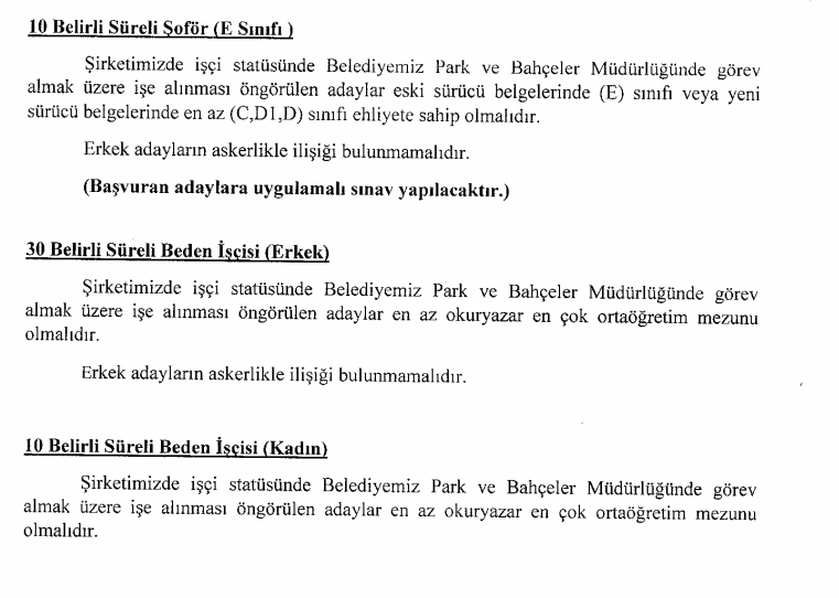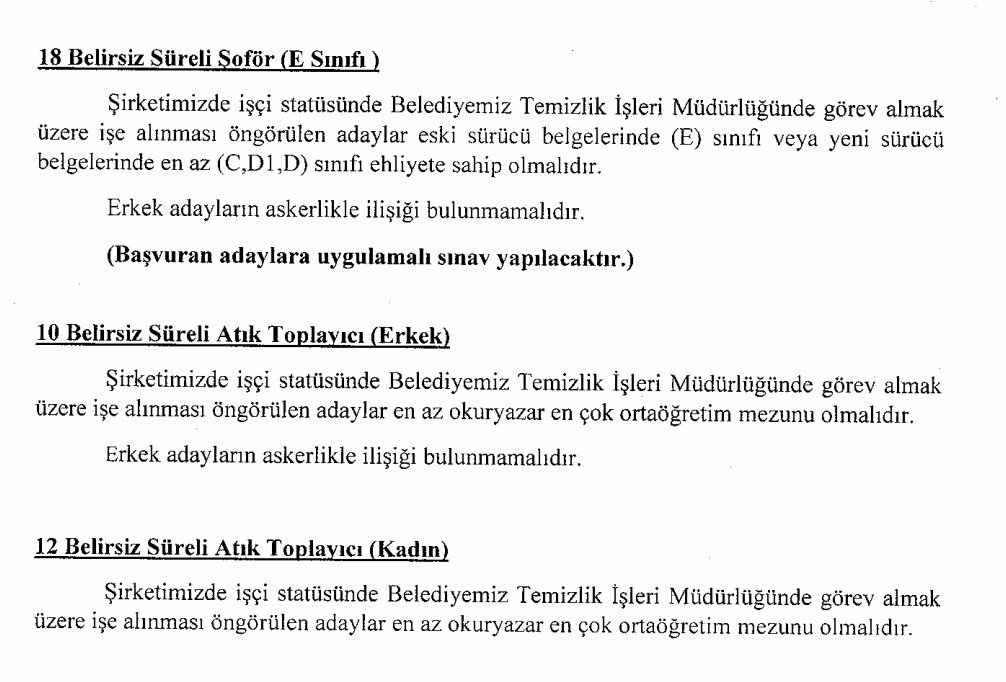 Personel alımına baktığımızda şoför kadrosuna 10, erkek beden işçisi kadrosuna 30, kadın beden işçisi kadrosuna 10, ulaştırma mühendisi kadrosuna 1, şoför kadrosuna 18, belirtsiz süreli atık toplayıcısı erkek kadrosuna 10, kadın kadrosuna ise 12 olmak üzere toplamda 91 personel alımı yapılacak.