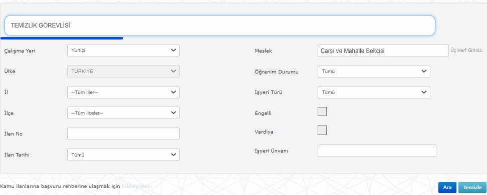 Yukarıdaki gibi aradığınız pozisyon yazan kısmına , başvuru yapmak istediğiniz kadroyu yazın ve ARA butonuna tıklayın. İlanlar aşağıda sıralanacaktır. Kadın erkek memurlar bu sayfada >>> TIKLA TAKİP ET