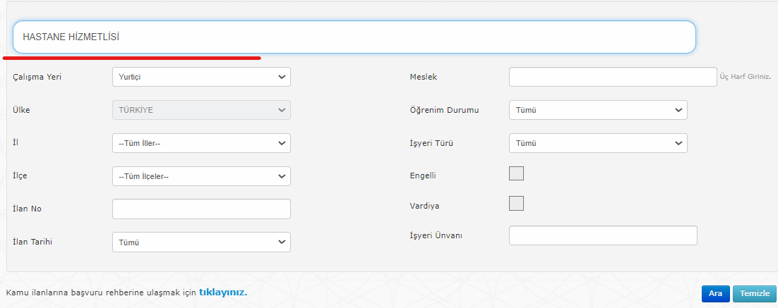 İŞKUR resmi internet adresi esube.iskur.gov.tr adresi üzerinden yayınlanan duyurulara baktığımızda hastanelere hastane hizmetlisi ve hastane temizlik personeli alımı yapılacağı görüldü. İŞKUR'daki resmi ilanlara baktığımızda başvuru bilgileri şu şekilde: