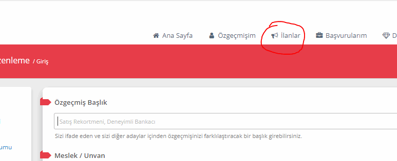 Burada sizden istenen bilgileri girin ve özgeçmişinizi oluşturun. Özgeçmiş oluşturduktan sonra aşağıdaki gibi ekranda İLANLAR yazan kısma tıklayın.