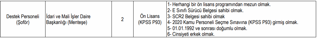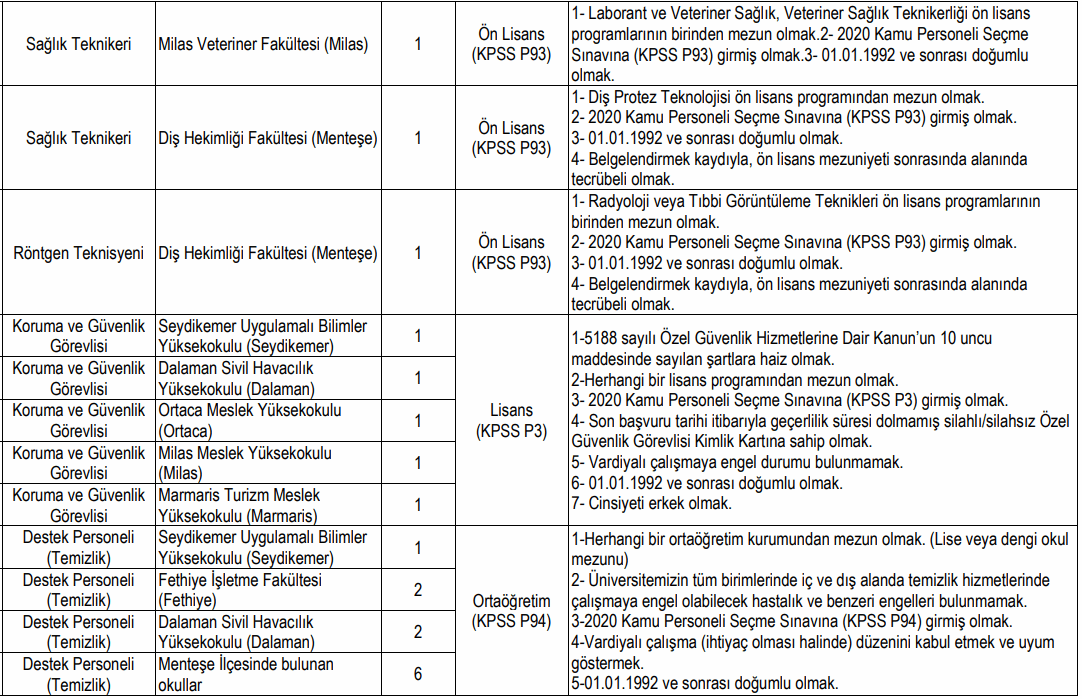 "Üniversitemize bağlı Muğla/Milas ilçesinde bulunan birimlerinde, 657 sayılı Devlet Memurları Kanunu'nun 4 üncü maddesinin (B) fıkrası uyarınca istihdam edilmek üzere, 06.06.1978 tarihli ve 7/15754 sayılı Bakanlar Kurulu Kararı ile yürürlüğe konulan "Sözleşmeli Personel Çalıştırılmasına İlişkin Esaslar"ın Ek 2 nci maddesinin (b) fıkrasına göre 'Yazılı ve/veya sözlü sınav yapılmaksızın 2020 KPSS (B) grubu puan sıralaması esas alınmak suretiyle' aşağıda belirtilen pozisyon ve niteliklerde 27 sözleşmeli personel alınacaktır" ifadeleri ile yayımlanan sözleşmeliş personel alımı ilanına baktığımızda alınacak personellerin mühendis, büro personeli, güvenlik görevlisi, psikolog, sağlık teknikeri, temizlik personeli ve güvenlik görevlisi kadrolarında istihdam edileceği görüldü.