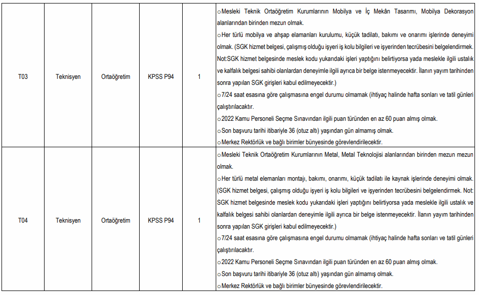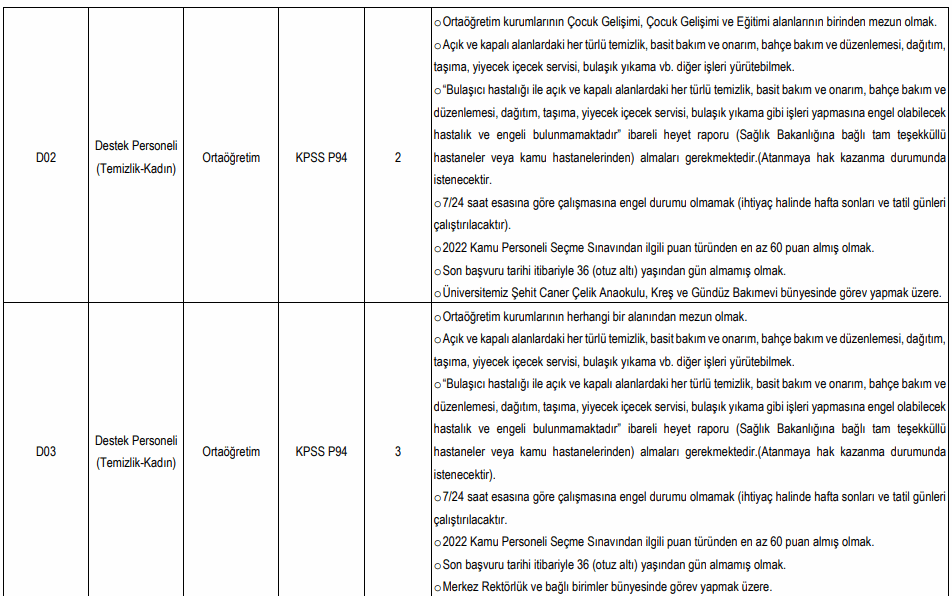 8. Tercih edilecek pozisyonun karşısında yer alan; öğrenim düzeyinden ve bölümlerden mezun olmak, cinsiyet kriterlerini sağlamak ve başvurunun