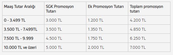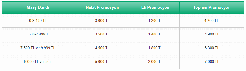 Promosyon Taahhütnamesi'nin imzalanması sonrasında ek bir koşul olmadan; bir aylık net gelir 3.499 TL'ye kadarsa 4.200 TL; 3.500 TL-7.499 TL arasındaysa 4.900 TL; 7.500 TL- 9.999 TL arasındaysa 6.300 TL; 10.000 TL' nin üzerindeyse 7.000 TL nakit promosyon ödenir.