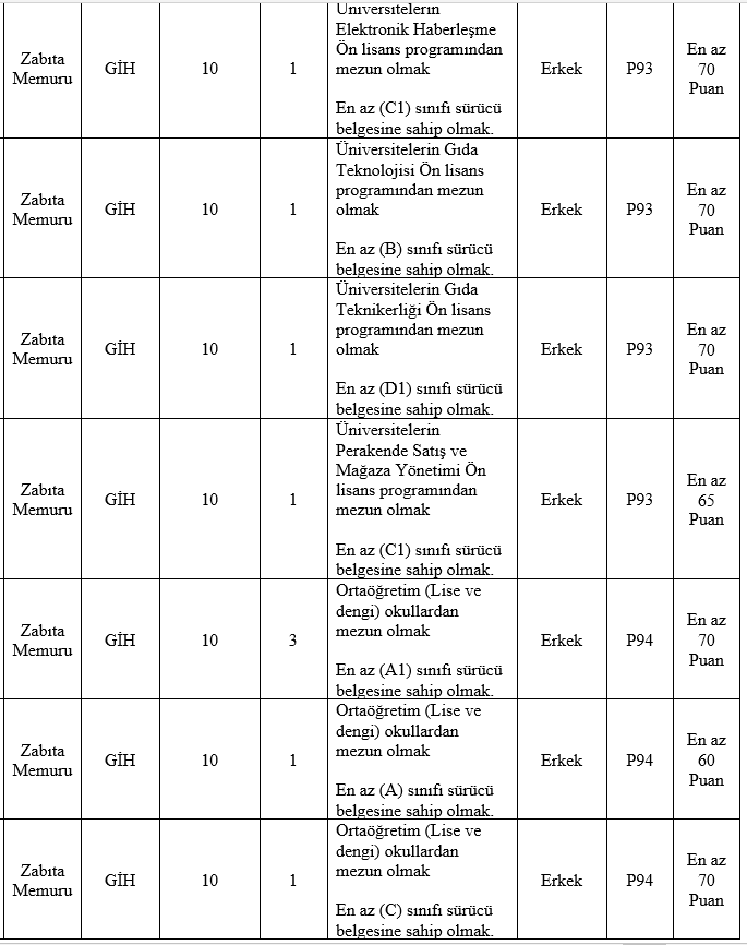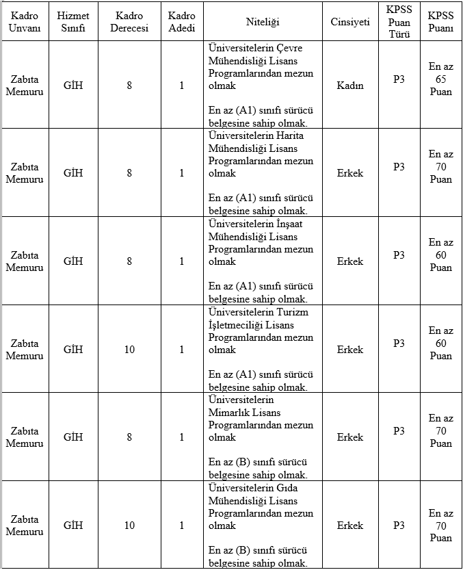 a) İlan edilen zabıta memuru kadroları için, mezun olunan okul itibariyle öğrenim şartını taşımak ve bu öğrenimle ilgili olarak 2022 yılı Kamu Personel Seçme Sınavından (KPSS) alım yapılacak unvanların karşısında belirtilen puan türlerinden, belirtilen asgari KPSS puanını almış olmak,
