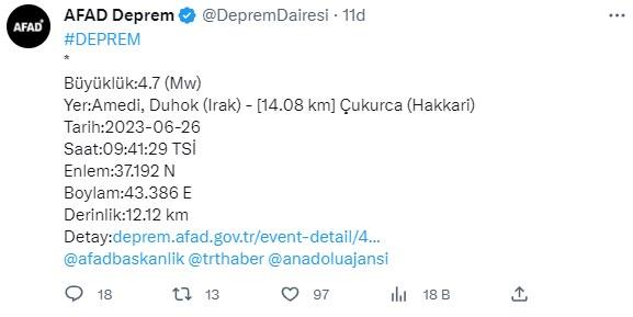 İçişleri Bakanlığı Afet ve Acil Durum Yönetimi Başkanlığı (AFAD), Hakkari'nin Çukurca ilçesinde 4.7 büyüklüğünde bir deprem olduğunu bildirdi. Sarsıntı Irak'ın Duhok kentinde ve Hakkari'nin çevre illerinde de hissedildi.