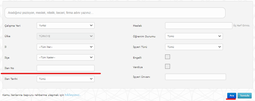 İlan no yazan kısma başvuru yapmak istediğiniz ilan numarasını yazın ve ardından ara tuşuna basın. İlanlar sıralanacaktır.