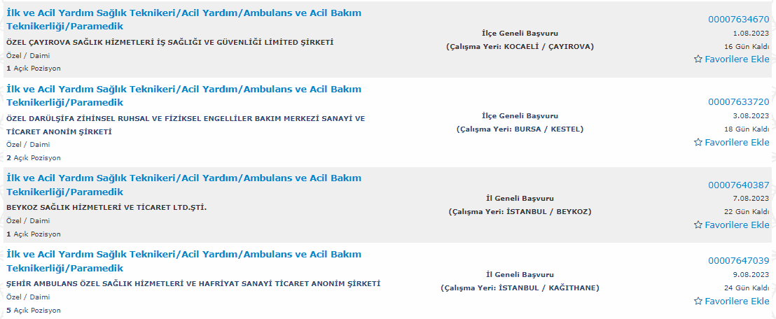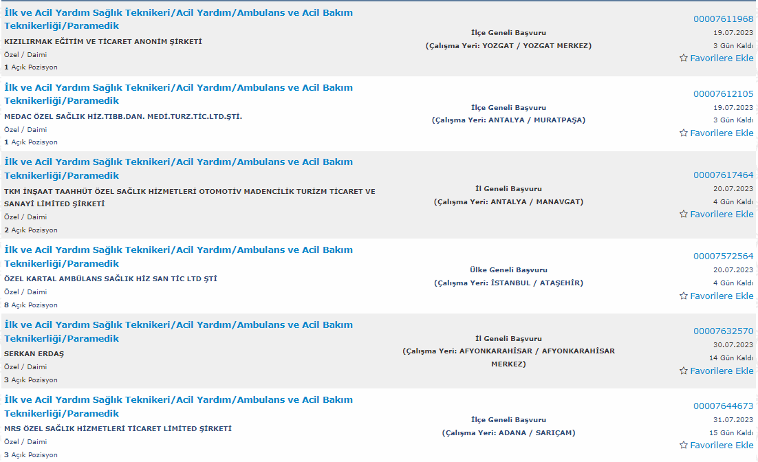 İlk ve Acil Yardım Sağlık Teknikeri Alımı İlanları şu şekilde;