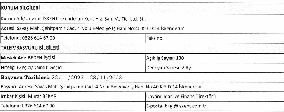 Hatay İskenderun Belediyesi İSKENT 100 işçi alacak.