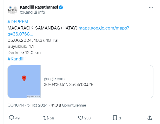 Kandilli Rasathanesi ve Deprem Araştırma Enstitüsü verilerine göre, Hatay'ın Samandağ ilçesinde 4.1 büyüklüğünde deprem meydana geldi. Saat 10.37'de yaşanan depremin derinliğini ise 12.0 kilometre olarak ölçüldü.