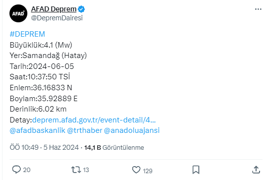 Bir diğer açıklamada Afet ve Acil Durum Yönetimi Başkanlığı'ndan geldi. AFAD, depremin büyüklüğünü 4.1 olarak açıklarken, derinliğini ise 6.02 kilometre olarak bildirdi.